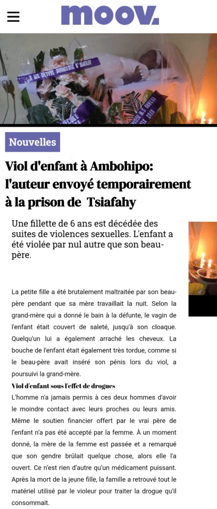 Un père de famille à Ambohipo, a été arrêté, le 13 Février, pour avoir commis un acte d’agression sexuelle à sa fille, qui, malheureusement est décédée quelques jours plus tard. Toutes les preuves ont été réunies pour condamner le père, qu’il s’agisse de viol sur enfant ou de consommation de drogue. Un autre cas dans la région Sofia, en 2022, un père divorcé et très connu pour sa toxicomanie, ayant pris une dose surélevée de cannabis, a fini par violer sa propre fille âgée de huit ans seulement.