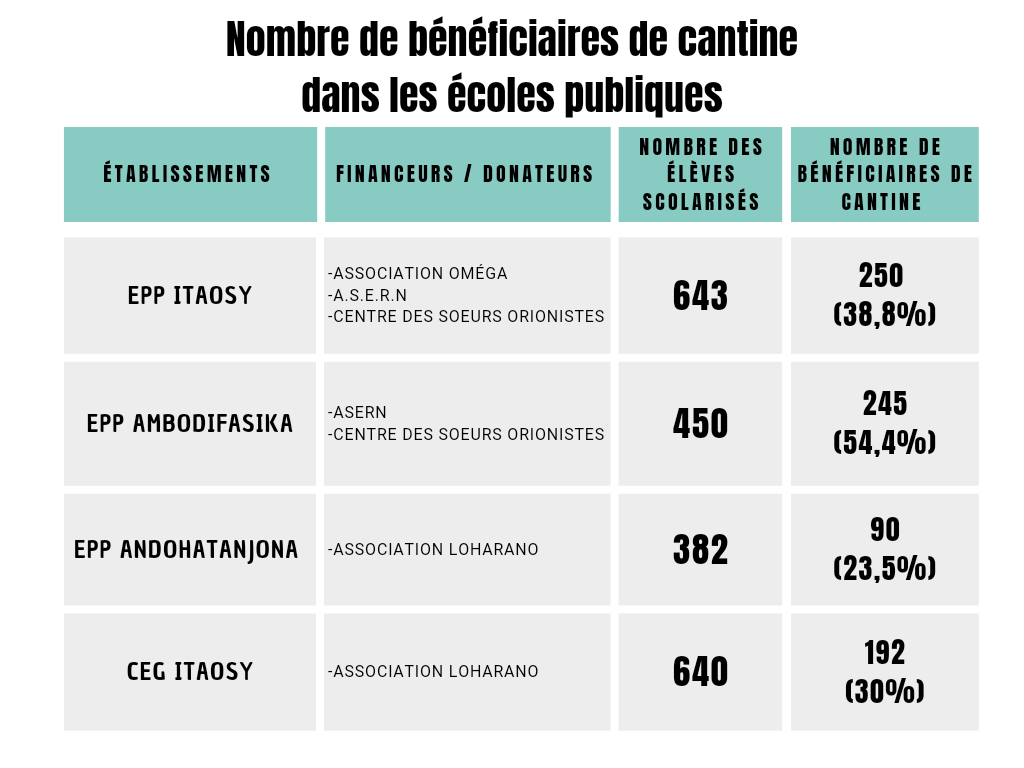À Itaosy, commune rurale où j’ai fait personnellement des recherches, les trois écoles publiques fonctionnelles distribuent des repas pour quelques enfants chaque jour. Toutefois, cela se fait en fonction des programmes comme Loharano ou des dons du seul Centre Catholique. L’insuffisance des équipements de cantine représente de réels obstacles dans quelques établissements. Dans l’école primaire Itaosy et Andohatanjona, dans le District d’Atsimondrano, le réfectoire ne peut contenir qu’une trentaine d’élèves, alors qu’il y a plus de 100 bénéficiaires par jour. Cette situation entraîne forcément un décalage sur l’heure du repas pour d’autres. Les deux tiers des écoles publiques de la capitale sont concernés par le même conditionnement.